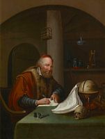 In deze variant van een schilderij van Gerard Dou staart een geleerde alchemist in een met bont gevoerde mantel de toeschouwer direct aan terwijl hij zijn notitie componeert. Met een kleine quill pen met een open tekst voor zich, kan de alchemist bezig zijn met kopiëren, bewerken of vertalen. Kleine aardewerken vaatjes rusten op de plank achter hem, en op de voorgrond zitten een wereldbol en een schedel. Dit laatste object fungeert als een "vanitas," of ijdelheid, symbool, dat de kijker herinnert aan de beknoptheid van het leven en het onvermijdelijke verstrijken van de tijd.