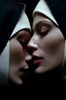 Een extreme close-up van twee vrouwen in zwarte ordegewaden met witte kapjes. Hun gezichten zijn naar elkaar gericht, hun ogen gesloten, hun lippen raken elkaar bijna. Het licht is zacht en gericht, en modelleert de huid en jukbeenderen plastisch tegen de donkere achtergrond. De compositie is strak, bijna symmetrisch, met een sterk…