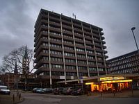 Gelsenkirchen centrum met het stadsbestuur, het Hans Sachs Huis en de kerken op de achtergrond
