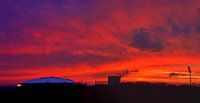 Zonsondergang in Gelsenkirchen boven de Veltins Arena, het Marriot Hotel en de schijnwerpermast van het oude Parkstadion