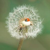 Een klein lieveheersbeestje zit op een paardenbloem.
