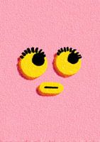 Dit kunstwerk toont een schattig geel gezicht met zwarte wimpers op een roze achtergrond. In een viltachtige stijl combineert de illustratie zachte pastelkleuren, minimalistische vormen en een oppervlak met textuur. Het eenvoudige ontwerp en de vrolijke, vriendelijke uitstraling brengen vreugde en positiviteit over. De zachte kleuren en…