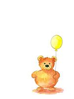 Happy Bärsday is een aquarel schilderij in portret formaat geschilderd door de kunstenaar Karen Kaspar. Een schattige kleine teddybeer met knuffelbruine vacht houdt een touwtje in één poot met een gele ballon die aan het uiteinde zweeft. De beer staat op de grond voor een neutrale witte achtergrond en kijkt naar de kijker met een vriendelijke glimlach.