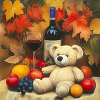 Een teddybeer zit te midden van een arrangement van herfstbladeren, een fles wijn en verschillende vruchten. De warme kleuren en gezellige compositie roepen een herfstgevoel op.