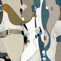 Abstract werk met geometrische vormen, fijne lijnen en kleurtonen in blauw-beige, wit, zwart en bruin.