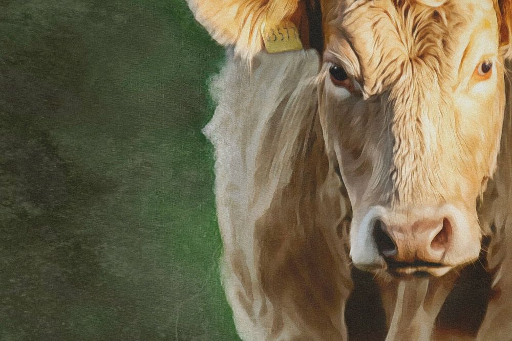 Het motief toont een imposante, vrolijke koe tegen een levendige groene achtergrond die frisheid en nabijheid van de natuur uitstraalt.