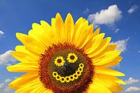 Zonnebloem met lachend gezicht, blauwe lucht met kleine wolken
