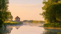 Een horizontale 16:9 foto van een vroege zomerochtend met een laagje mist over het Damsterdiep bij het "Gemaal Ons Belang", gelegen tussen Ten Boer en Ten Post in de provincie Groningen.