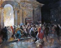 Hier komen allemaal gasten aan voor een avond uit, aangekleed voor het bal, in het donker van de avond. Het schilderij is frivool en feestelijk van stijl en draait…