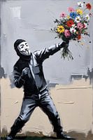 Dit moderne kunstwerk toont een gemaskerde figuur die een boeket bloemen werpt. Het beeld combineert kracht en kwetsbaarheid, waarbij de bloemen als symbool van vrede staan in contrast met de houding van protest. Het schilderij spreekt een breed publiek aan door zijn herkenbare elementen en contrastrijke kleurenpalet. Het past perfect…