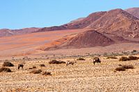 Wilde gemsbokken (oryxen of spiesbokken) overleven in een surrealistisch woestijnlandschap met warme kleuren in de Namib Woestijn. Wildlife tussen paarse bergen en oranje zandduinen, vlak na zonsopgang. Lüderitz, Namibië, Afrika.