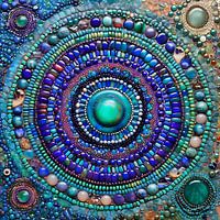 Kleurrijke abstracte mandala met een collage van gesmolten edelstenen zoals amathist,fluoriet,turkoois en lapis lazuli (lazuriet) in voornamelijk blauw,paars en smaragdgroene tinten.