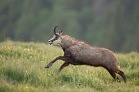 Gemzen ( Rupicapra rupicapra ) in een snelle run over een bronweide in de bergen, wildernis, Europa.