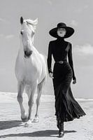 De zwart-witfoto toont een elegant geklede vrouw in een lange, vloeiende zwarte jurk en een breedgerande hoed, die zelfverzekerd door een helder, woestijnachtig landschap stapt. Een wit paard loopt naast haar in hetzelfde ritme. Het gereduceerde landschap, de heldere horizon en het sterke contrast tussen licht en donker focussen op…