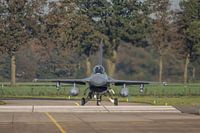 Nog even geduld... een F-16 van de Koninklijke Luchtmacht taxiet richting de kop van baan 24 om daarna met naverbrander op te stijgen van vliegbasis Volkel.