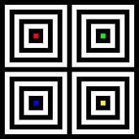 Centraal geplaatste vierkante strepen, matrix 02x02, aantal nesten N=4, middenrood, groen, blauw en geel, centraal geplaatst