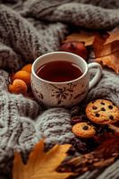 In het midden van de knusse gebreide deken ontvouwt zich een warm tafereel: een dampende kop thee omringd door herfstbladeren, terwijl heerlijke koekjes er verleidelijk naast liggen. Een harmonieuze mix van warme kleuren en rustieke charme die de gezelligheid van herfstdagen perfect belichaamt. Uitnodigend en rustgevend, deze aanblik belooft zoete momenten van plezier.