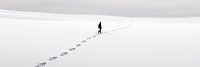 Midden in een eindeloos sneeuwlandschap schrijdt een eenzame figuur vastberaden voort. De weidse, monochrome uitgestrektheid wordt alleen onderbroken door de sporen in de sneeuw, die een stil verhaal vertellen van vastberadenheid en isolatie. De grijze lucht onderstreept de melancholische stemming en maakt het landschap mysterieus en spookachtig.