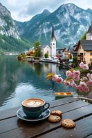 Een heerlijk kopje koffie staat uitnodigend op tafel en belooft plezier en ontspanning. Het uitzicht reikt over het glinsterende water van het Hallstatt meer, terwijl majestueuze bergen op de achtergrond torenen. Hun ruige toppen zijn gehuld in zachte wolken en worden weerspiegeld in het kalme water. De combinatie van de aromatische koffie en het indrukwekkende berglandschap creëert een perfect moment van rust en contemplatie. Hier kun je tot rust komen en volop genieten van de schoonheid van de natuur.