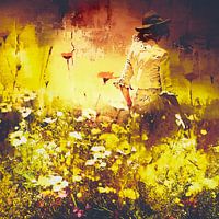 Genieten van de zomerse zonsondergang, zo te zien geniet deze jonge vrouw in haar landelijke kleding daar echt van. Haar hoed beschermt haar gezicht tegen die laatste zonnestralen. Ze is wel wat in gedachten verzonken, wellicht veroorzaakt door het mooie warme licht dat die laatste zonnestralen met zich meebrengen. Ze loopt langzaam door een veld vol wilde bloemen. Klaprozen, Fluitekruid en wat al niet meer, zijn te vinden in dit veld. Het ziet er fleurig uit en weelderig uit. De lucht voor haar verkleurt langzaam maar zeker naarmate de zon achter de horizon verdwijnt. De dag loopt op z'n eind en dus is het wellicht tijd om naar huis te gaan. De kleuren van dit schilderachtige werk zijn warm en dus is er geel, oranje bruin en wat magenta gebruikt, in vele tinten, om de sfeer van deze zomerse zonsondergang weer te geven. Een sfeervol kunstwerk dat elke huis meer kleur zal geven.