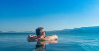 Een man geniet van het uitzicht vanuit een zwembad die een prachtige baai overziet met bergen op de achtergrond.