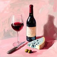 Een harmonieus samenspel van dieprode wijn, sprankelend in een elegant glas, en een heerlijke blauwe kaas die klaar is om ontdekt te worden. Olijven maken het geheel af, terwijl de zachtroze achtergrond een warme, uitnodigende sfeer creëert. Hier ontmoeten plezier en esthetiek elkaar in perfecte vorm.