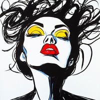 In dit boeiende portret zien we een vrouw met zwart haar, gele oogschaduw en felrode lippen, uitgevoerd in een pop art stijl met een vleugje cartoon.