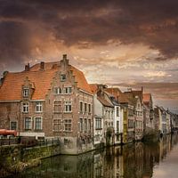 Foto van de stad Gent, in België. De foto is gemaakt van de Kraanlei, bij het Huis van Alijn. De kleuren van de zonsondergang spiegelen in het water van de Leie. De historische huisjes geven de foto het aanzicht van een middeleeuws schilderij.
