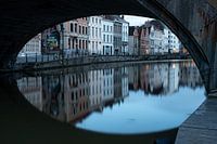 Reflectie van oude panden in de binnenstad van Gent (Belgie). Het is een doorkijkje onder de oude brug.