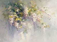 Gentle Colors of Spring Breeze - Dit bloemen schilderij toont een weelderige samenstelling van delicate wisteria bloemen, kunstig neergezet in een overkoepelende boog van groen en zacht pastelkleurige bloesems. De achtergrond van het kunstwerk is vaag en overwegend in lichte, atmosferische tinten, waardoor de nadruk fel op de bloemen komt te liggen. De bladeren, variërend van fris jong groen tot dieper groen, geven een gevoel van levendigheid en natuurlijke groei, terwijl de lange, hangende bloementrossen, gekleed in tinten van wit, roze en subtiel paars, een etherische en bijna dromerige sfeer creëren. De verftechniek is impressionistisch met zichtbare penseelstreken die een dynamisch en textuurrijk oppervlak vormen, wat de kijker het gevoel geeft rechtstreeks in een lenteachtige tuin te staan.