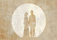 Gentle Glow of Togetherness - Dit mensen schilderij toont een man en een vrouw, stilstaand tegen de achtergrond van een grote, bijna transparante volle maan. Het canvas is bedekt met een rustgevend beige, aardetinten palet, waarbij de textuur van het canvas licht zichtbaar is door de verflagen heen, wat een gevoel van diepte en complexiteit toevoegt. Deze personen zijn centraal maar subtiel afgebeeld binnen de lumineuze maancirkel, die fungeert als een aura van licht om hen heen. Hun silhouetten zijn minimaal gedetailleerd; je kunt contouren onderscheiden die kleding en basale menselijke trekken suggereren, maar de focus ligt op hun samenzijn binnen die cirkel van licht. Het gebruik van licht en schaduw binnen het schilderij benadrukt de verbondenheid tussen de twee figuren en versterkt het sentiment van intimiteit en samenhorigheid.