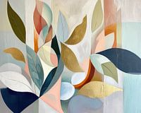 Gentle Nature's Geometry - Dit abstracte bladeren schilderij toont een harmonieuze composities van gestileerde bladvormen en organische structuren. Het kleurenpalet varieert van zachte pasteltinten tot diepe, rijke aardetinten en bevat opvallende accenten van metallic goud. De bladeren overlappen elkaar en zijn opgebouwd uit diverse geometrische en organische vormen, wat een dynamische maar tegelijkertijd rustgevende visuele ervaring creëert. De textuur is op sommige plekken verhoogd, wat een tactiele dimensie toevoegt aan het visuele effect. De kunstenaar maakt gebruik van verschillende schakeringen en tonen om diepte en lichtvariatie binnen de compositie te suggereren, wat resulteert in een gelaagde en complexe afbeelding. Dit schilderij, dat een mix van moderniteit en natuurlijke elementen uitstraalt, zendt een gevoel van rust en contemplatie uit.