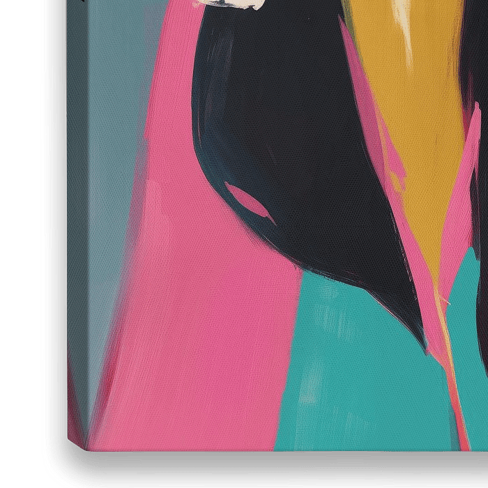 Een dromerig en speels modern vrouwenportret vol kleur, zachtheid en karakter. In dit werk straalt de vrouw rust en zelfvertrouwen uit: gesloten ogen, een kalme houding en een bijna meditatieve sfeer. De combinatie van turquoise, roze, oker en zwart geeft het beeld een frisse, eigentijdse look—alsof fashion illustration en schilderkunst…