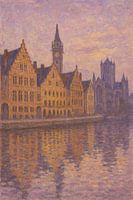 Als de schemering zich over Gent ontvouwt, wordt de stad een droom van kleur en verstild licht. De oude gildehuizen langs de Leie glinsteren met honing- en lila tinten, hun elegante gevels weerspiegeld in het kalme avondwater. Geïnspireerd door Claude Monet's fascinatie voor veranderend licht, vangt dit schilderij dat ongrijpbare moment…