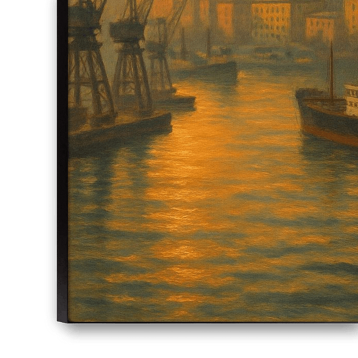 In dit werk komen industrieel realisme en poëtische sfeer samen. De kunstenaar schildert niet de arbeid van de haven, maar haar waardigheid - de architectuur van menselijke inspanning badend in een goddelijke zachtheid. De kranen en schoorstenen zijn gereduceerd tot elegante silhouetten, verzacht door mist en avondlicht. De compositie bereikt een zeldzame balans tussen beweging en stilte.