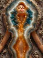 Dit digitale kunstwerk verbeeldt een surrealistische samensmelting van menselijke anatomie en geologische schoonheid. Een vrouwfiguur ligt sierlijk op een gestructureerd oppervlak dat lijkt op zand of steen en is bedekt met een levendig, geode-achtig patroon. De kristalformatie loopt verticaal langs haar lichaam, waardoor de illusie ontstaat dat de mens uit een geode tevoorschijn komt. Levendige tinten oranje, blauw, wit en glinsterend goud doen denken aan minerale afzettingen en zijn doordrenkt met complexe texturen die diepte, transformatie en innerlijke glans symboliseren. De compositie combineert organische en elementaire esthetiek en symboliseert de verbinding tussen de natuur en de menselijke geest. Ideaal voor verzamelaars van symbolische, emotionele digitale kunst - een expressief werk voor moderne ruimtes, galeriemuren of spirituele kunstcollecties.