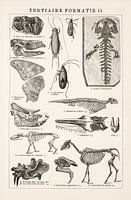 Fraaie antieke afbeelding met fossielen uit het tertiair. Het Tertiair is een geologisch tijdperk dat volgt op het Krijt en wordt opgevolgd door het Kwartair. Het Tertiair duurde van 66,0 tot 2,58 miljoen jaar geleden. Wij zien o.a. geraamtes van zoogdieren zoals mastodont en dinosaurus.