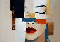 Geometric Whisper - Dit vrouwenportret schilderij toont een abstracte afbeelding van een vrouwengezicht met prominente rode lippen en gesloten ogen, samengesteld uit zuiver geometrische vormen en een gedurfde combinatie van neutrale en levendige kleuren.