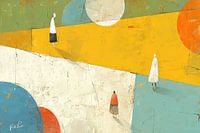 Details: abstract, schilderij, figuren, geometrisch, geel, oranje, blauw, kunst, moderne kunst, stijlvol