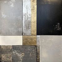 Geometrie | Gilded Geometry - Dit abstracte schilderij bestaat uit een compositie van verschillende geometrische vlakken, rijk aan textuur en variaties in mat en glanzend, gebruikmakende van zwart, wit en goud als dominante kleuren.