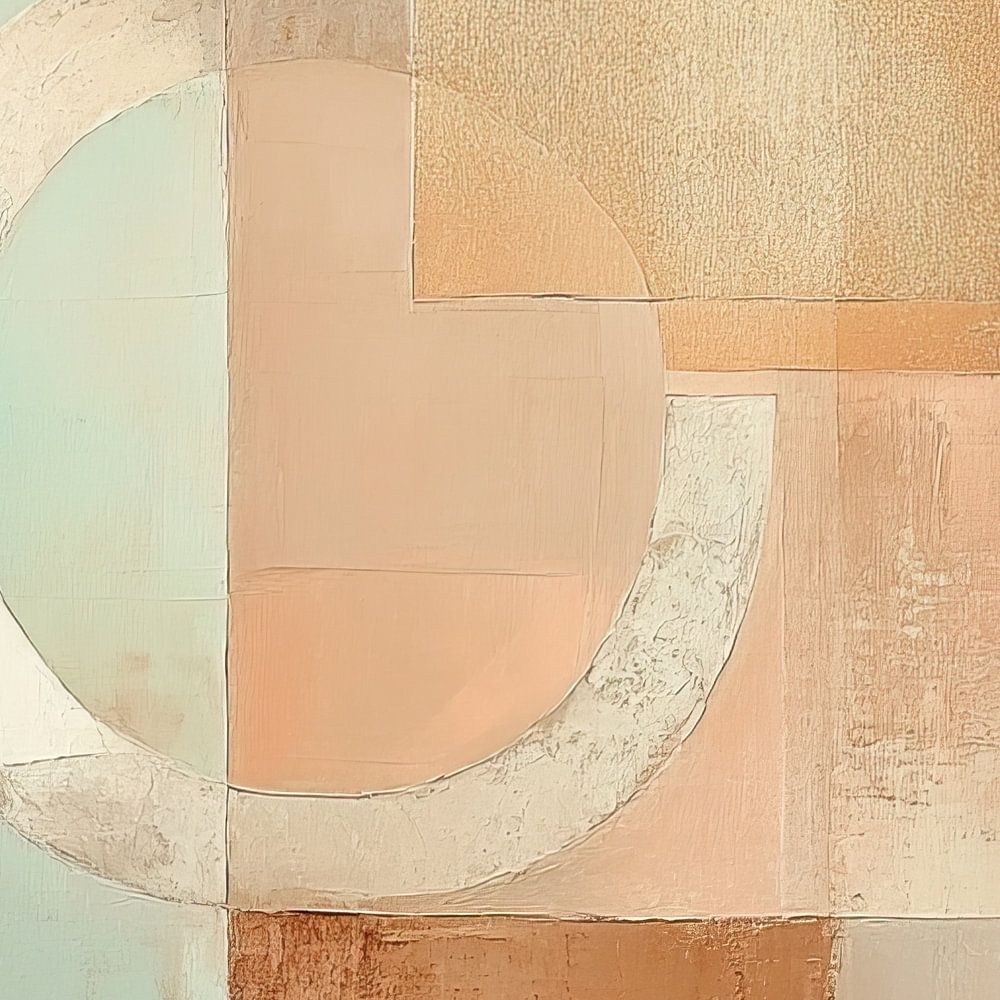 Geometrie | Serene Shapes and Shades - Dit abstracte schilderij toont een compositie van geometrische vormen waaronder een grote cirkel en rechthoekige blokken in tinten beige, wit en blauw, waardoor een rustige en harmonieuze uitstraling ontstaat.