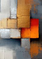 Geometrie | Textured Blocks of Time - Dit abstracte schilderij toont geometrische vormen met textuurrijke toepassingen van zilver, goud, en oranje verf, resulterend in een dynamisch, gestructureerd kleurenspel.
