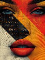 Dit moderne kunstwerk combineert de verfijning van een vrouwelijk portret met de kracht van geometrische kleurvlakken. Het gezicht wordt doorkruist door diagonale stroken in gedurfde tinten rood, geel, zwart en wit, aangevuld met delicate stippen en lijnpatronen. Haar expressieve blauwe ogen en sensuele rode lippen geven het werk een…
