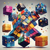 Dit werk stelt een dynamische compositie van zwevende kubussen voor, elk bedekt met een kleurrijk patroon dat herinnert aan de bekende Rubik's Cube. De kubussen lijken in een staat van gewichtloosheid, omringd door zwevende verfspatten die een gevoel van beweging en speelsheid toevoegen.