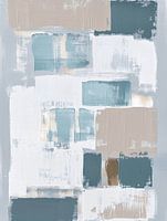 abstracte compositie opgebouwd uit rechthoekige en vierkante vlakken in een zachte, harmonieuze kleurenpalet. Het werk maakt gebruik van blauw, turquoise, beige en wit, die samen een serene en minimalistische sfeer creëren. De penseelstreken zijn los en expressief, waardoor de vlakken een textuur krijgen die diepte en beweging toevoegt…