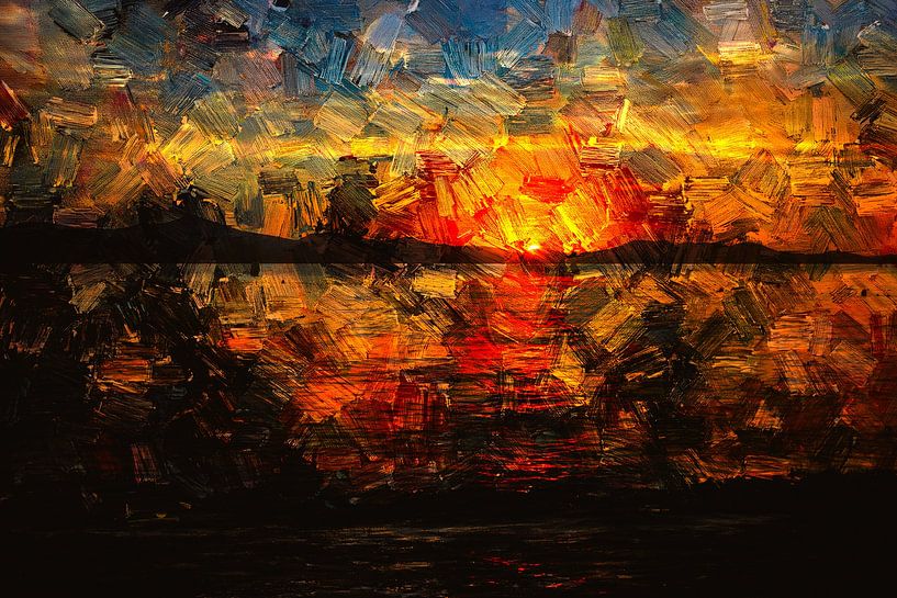 Een dynamisch spel van krachtige, mozaïekachtige penseelstreken breekt het klassieke motief van een zonsondergang op in honderden stralende kleurfragmenten.