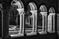 Een rustig moment in de kloostergang van een Frans klooster, vastgelegd in zwart-wit. Op de voorgrond opent zich een blik op de centrale groene ruimte, geometrisch gestructureerd, met zorgvuldig gesnoeide buxusbomen en een eenvoudige fontein als centrum van rust. Het tegenoverliggende deel van het klooster strekt zich uit in duidelijke lijnen, de stenen bogen en kolommen werpen zachte schaduwen op het plaveisel. Licht en structuur, natuur en architectuur gaan een rustige dialoog aan - een plaats van devotie, tijdloos en contemplatief.