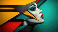 Het schilderij "Geometrie van de Stilte" combineert heldere, scherpe lijnen en gedurfde vormen met een zachte, bijna meditatieve uitstraling. De gelaatstrekken van de afgebeelde figuur zijn gestileerd, maar stralen tegelijkertijd een kalme elegantie uit. De kleurencombinatie van warme gele en rode tinten en koel groen en zwart geeft het beeld diepte en spanning. De geometrische elementen omlijsten het gezicht alsof ze deel uitmaken van een masker of futuristisch harnas dat het wezen zowel beschermt als zijn ware aard verbergt.