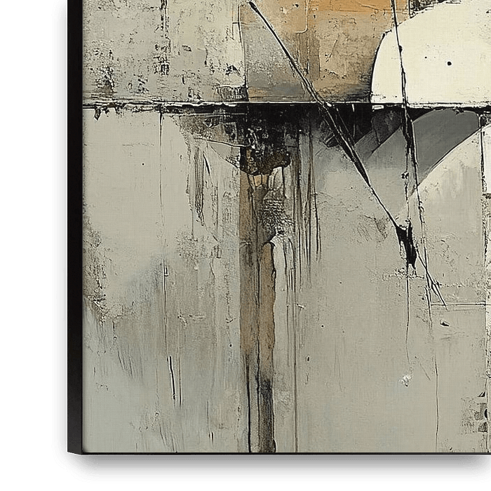 Geometrisch Abstract - Dit abstracte schilderij kenmerkt zich door een samenspel van geometrische vormen en een palet van vooral aardetinten, doorsneden door zwarte lijnen, waarbij de ruwe textuur en de subtiele kleurverschillen een diepte creëren die zowel rustgevend als intrigerend is.