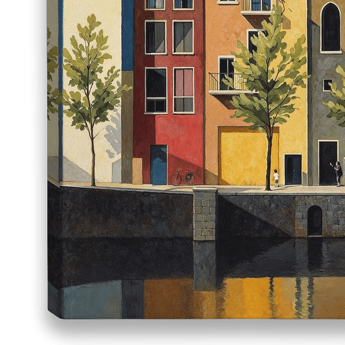 Stap in een kleurrijke en abstracte weergave van de iconische Amsterdamse grachten. Dit werk combineert de kenmerkende gevels van de stad met de speelse structuren van geometrische kunst, waarbij een balans wordt gevonden tussen traditie en moderniteit. De heldere, warme kleuren en strakke lijnen vangen de levendige energie van de stad,…